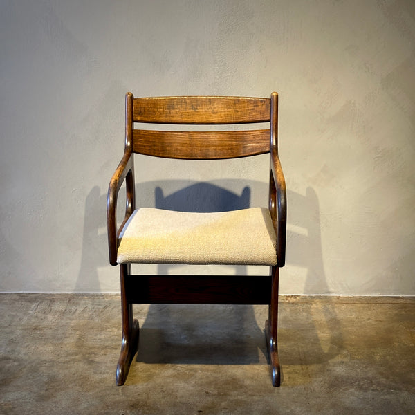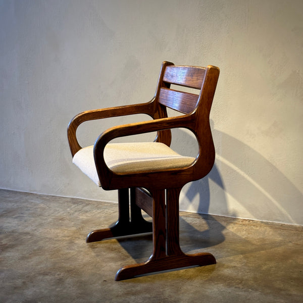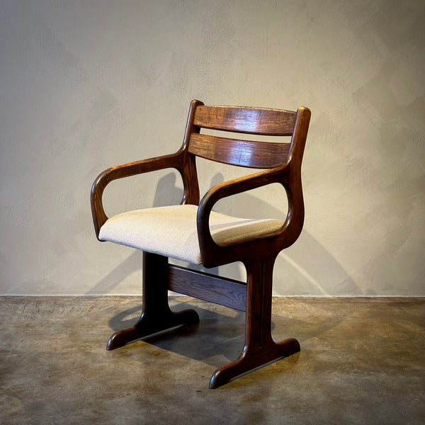 Brutalist Dutch midcentury Amsterdam School style armchair featuring a distinctively contoured wooden framework and a seat upholstered in high-quality linen. This piece, with its robust and elegant design, is ideal for office spaces or as a sophisticated accent chair. (2nd chair also available)